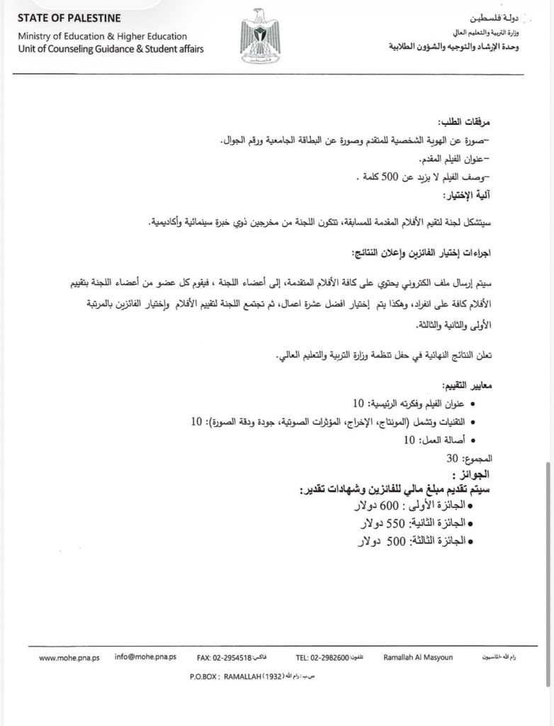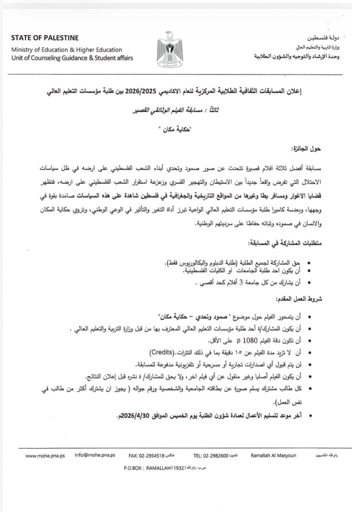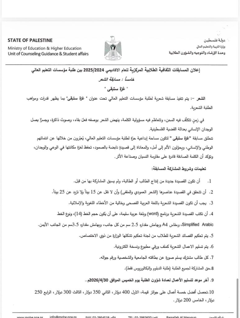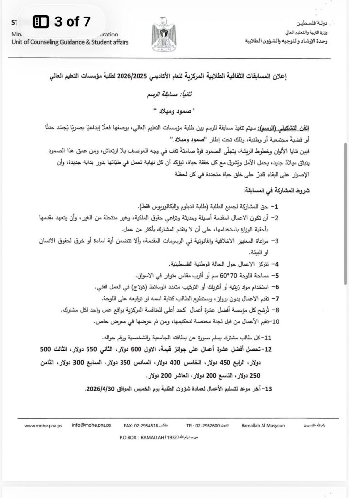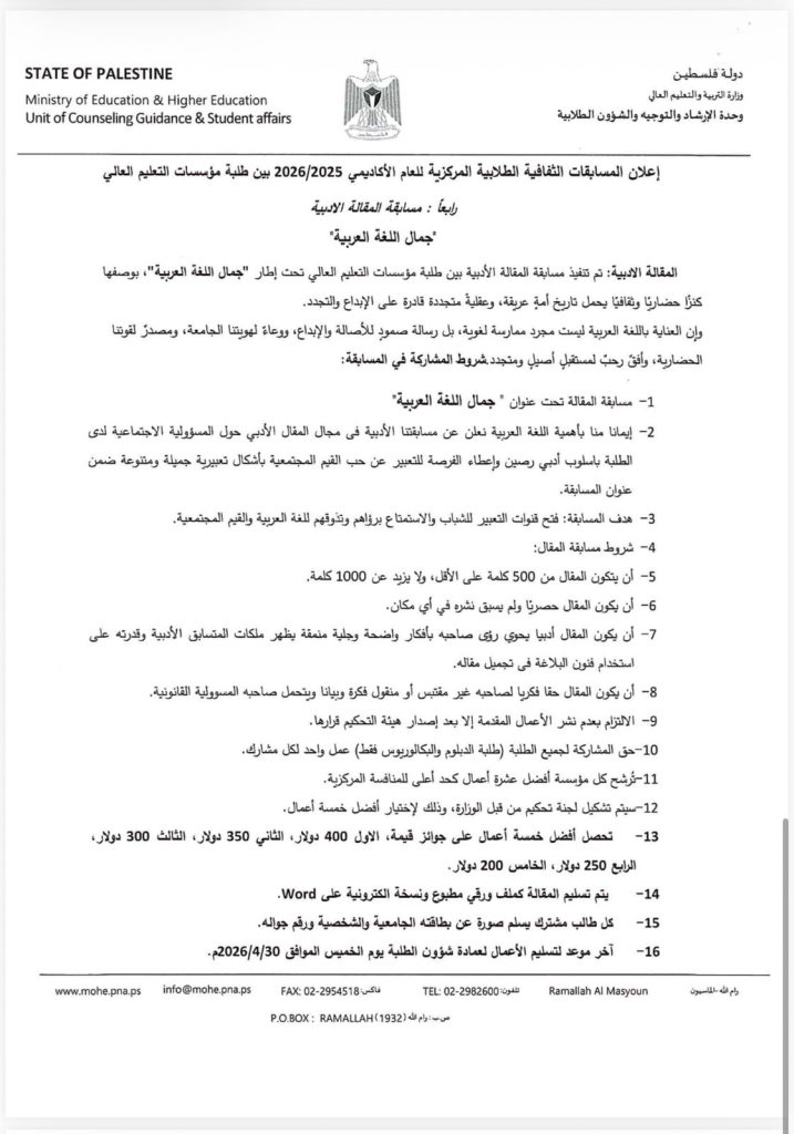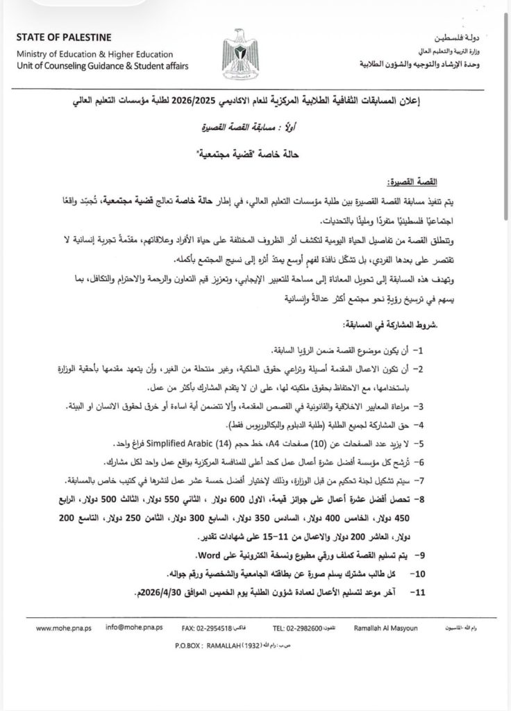 تُعلن وزارة التربية والتعليم العالي عن المسابقات الثقافية الطلابية المركزية للعام الأكاديمي 2025/2026 إذا عندك موهبة… هاي فرصتك تثبتها وتوصل صوتك! مجالات المسابقات: • القصة القصيرة • الرسم • الفيلم الوثائقي القصير • المقالة الأدبية • الشعر