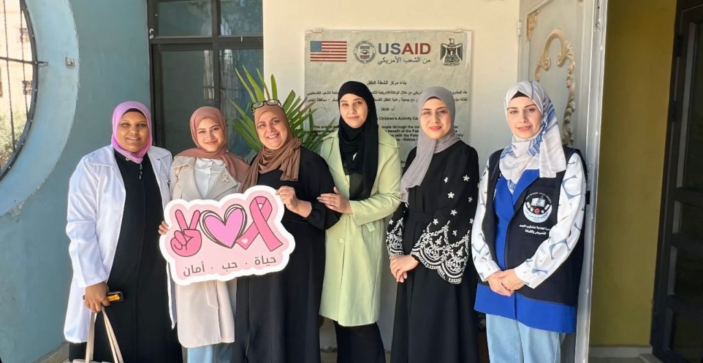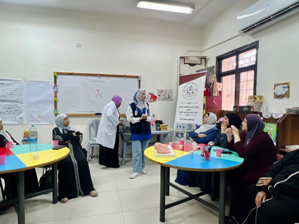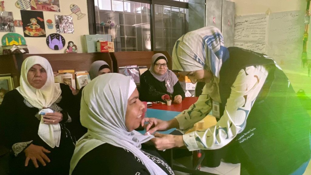 زار طاقم كلية الحاجة عندليب العمد جمعية رعاية الطفل الفلسطيني ” سفير” لعقد لقاء تثقيفي لنساء المخيم حيث تحدثت أ. عبلة ابو خيط مسؤولة قسم القبالة في الكلية عن سرطان الثدي وطرق الفحص الذاتي وأهمية الفحص المبكر فيما تحدثت أ. ياسمين خموس المرشدة التربوية في الكلية عن تقبل المرض وكيفية تخطي الصدمة الأولى للمرض وعن أهمية الدعم النفسي من قبل العائلة والاصدقاء